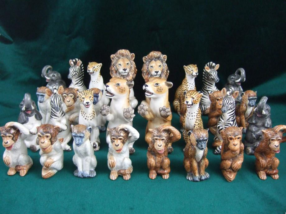 (Bassano del Grappa, edition of 200), with kings as lions, queens as lionesses, bishops as spotted leopards, knights as zebras, rooks as elephants with raised trunks, and pawns as monkeys in various poses, appears in Schachspiele Wandel Im Laufe Der Kunst Und Kulturgeschichte (Chess: Art History and Culture), Staatliches Museum Fur Vlkerkunde Munchen, 1988, plate 46, text pg 50.